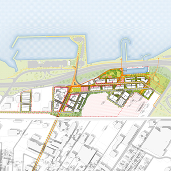 CLEarwater is a $979 million development that will cost $878 million and be delivered over four phases. The redevelopment aims to create a lakefront gateway district of connection, opportunity, and resilience. CLEarwater connects the city and lakefront with an underpass beneath the railway and a pedestrian bridge over I-90 that links St. Clair-Superior and the future CHEERS park. Multimodal mobility is encouraged through complete streets that integrate pedestrian, cycling, and public transit options. CLEarwater rezones general industrial into a high-density mixed-use zone, including creative office, light industrial makerspace, and a diverse housing stock. Retail spaces along the main corridor create lively streetscapes reflecting the existing community identity. The development offers 2214 housing units including 668 affordable and 380 above market. A creative financing strategy – including TIF, Opportunity Zone, Tax Credits, and State and Federal LIHTC – all support a private development scheme that advances public good. The two city owned parcels will be transformed into the Clearwater Innovation and Media Hub to provide educational opportunities through partnerships with Horizon Science Academy, Fox TV, Ohio Third Frontier. CLEarwater is committed to environmental sustainability and livable public space. Green elements include the five-acre Inlet Park and Overlook, the Clearwater Nature Education Center, and green infrastructure: bioswales, stormwater filtration, permeable pavement, native plantings.